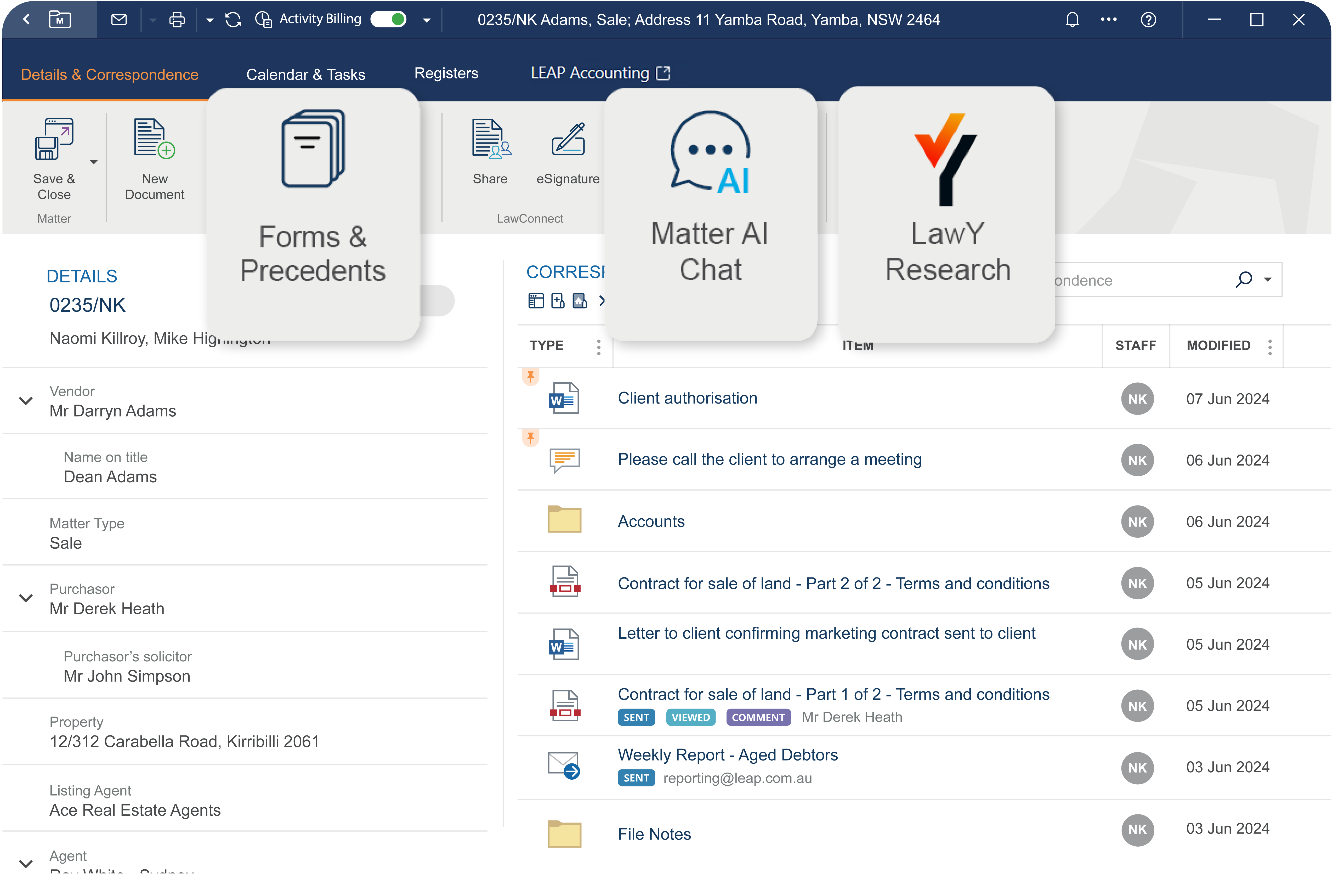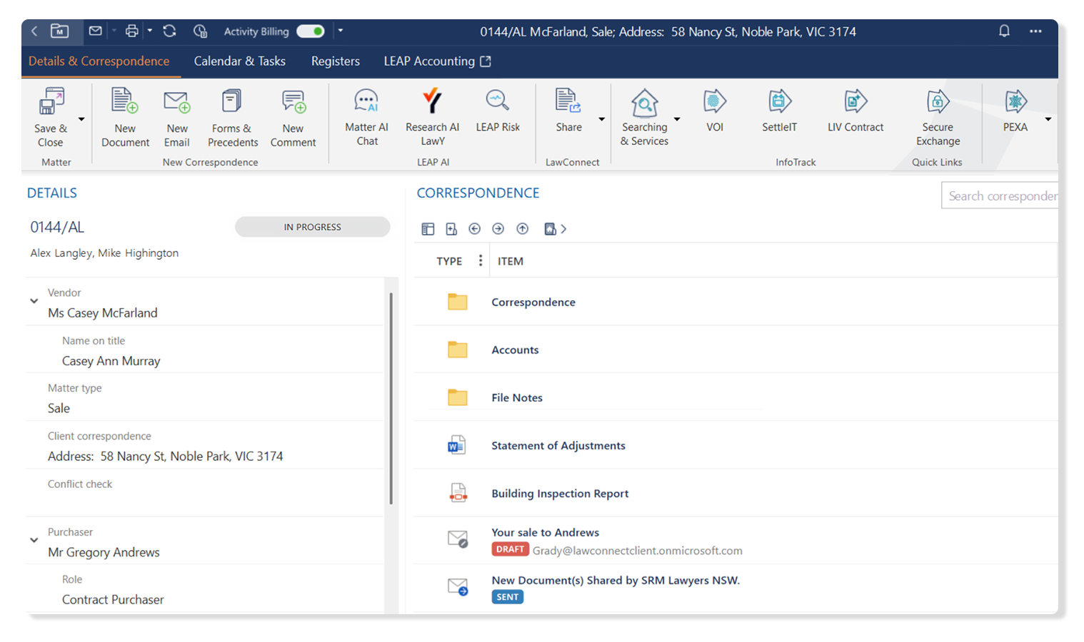 Securely share matter correspondence with clients and other parties associated with a LEAP matter using LawConnect.